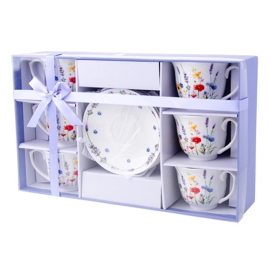 SOLEY Filiżanka i spodek (6+6) Zestaw filiżanek ze spodkami SOLEY (6+6) to elegancka propozycja wykonana z porcelany, idealna na każdą okazję. Czysta biel pięknie współgra z kolorowym, kwiatowym motywem, tworząc lekki i świeży charakter. Całość zapakowana jest w estetyczne pudełko prezentowe, a możliwość mycia w zmywarce zapewnia wygodę użytkowania na co dzień.