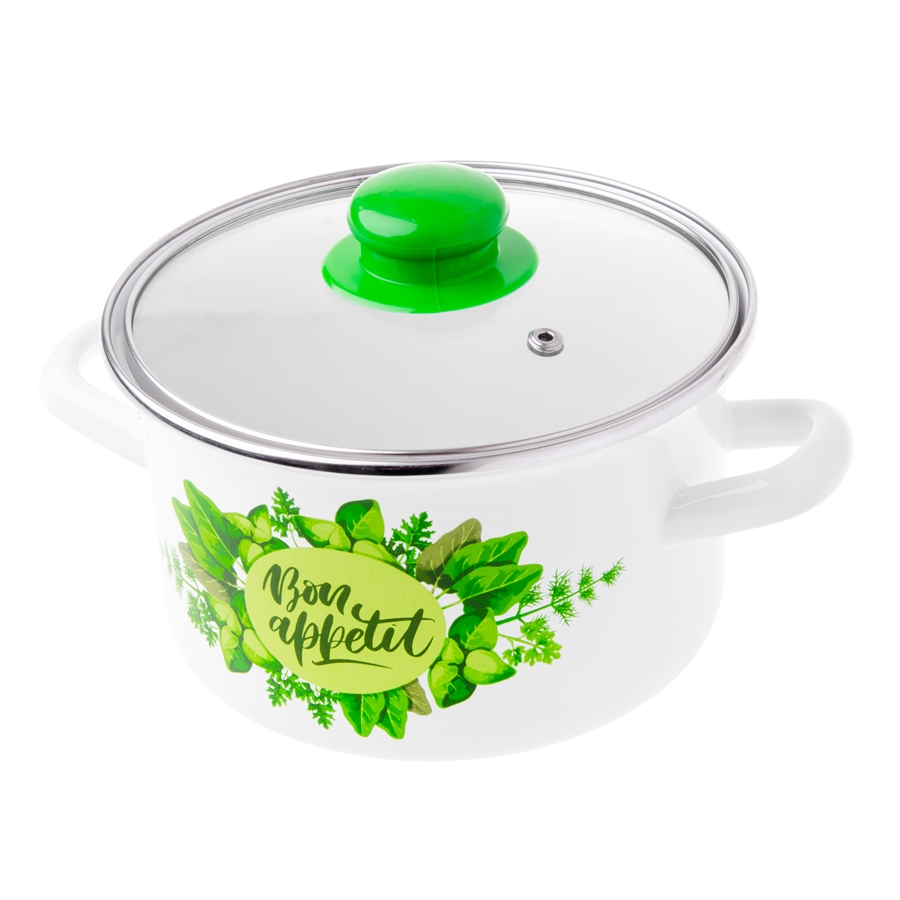Garnek BON APPETIT – prosty Garnek emaliowany BON APPETIT to praktyczne naczynie do codziennego gotowania. Wykonany ze stali i pokryty trwałą powłoką emaliowaną, skutecznie chroni przed korozją i pasuje do szerokiej gamy kuchenek. Biały kolor oraz motyw świeżych liści dodają mu wyjątkowego charakteru, a szklana pokrywka i pojemność 2,0 L (średnica 16 cm) sprawiają, że świetnie sprawdzi się w każdej kuchni.