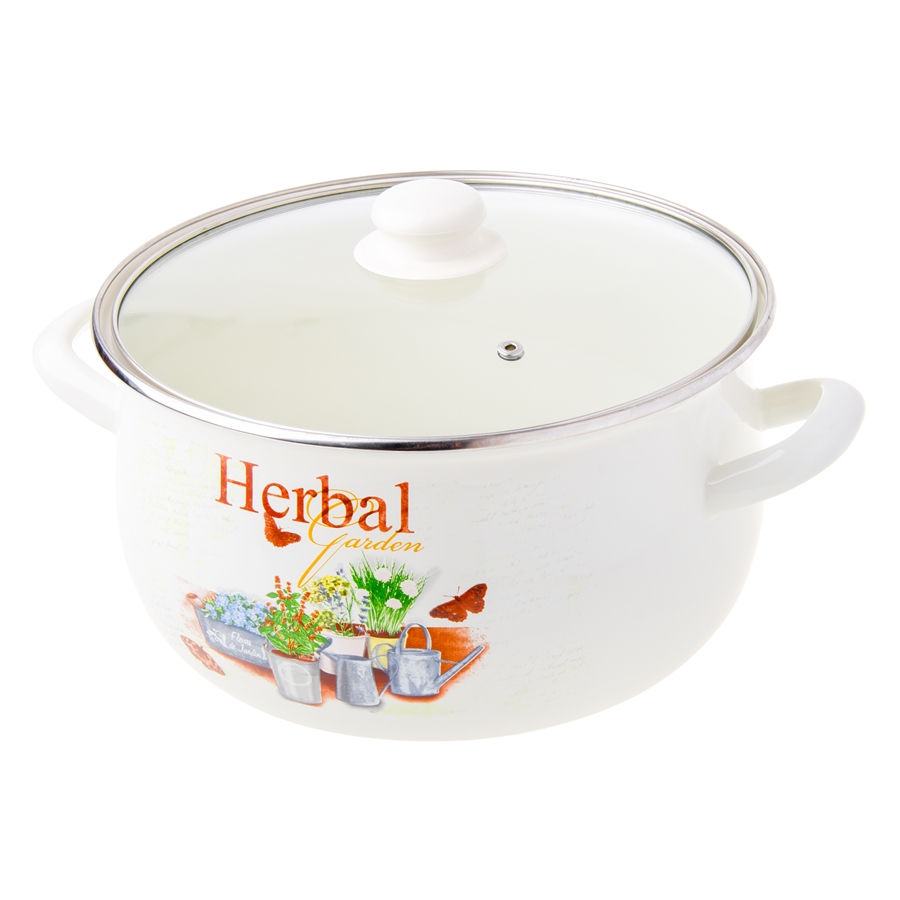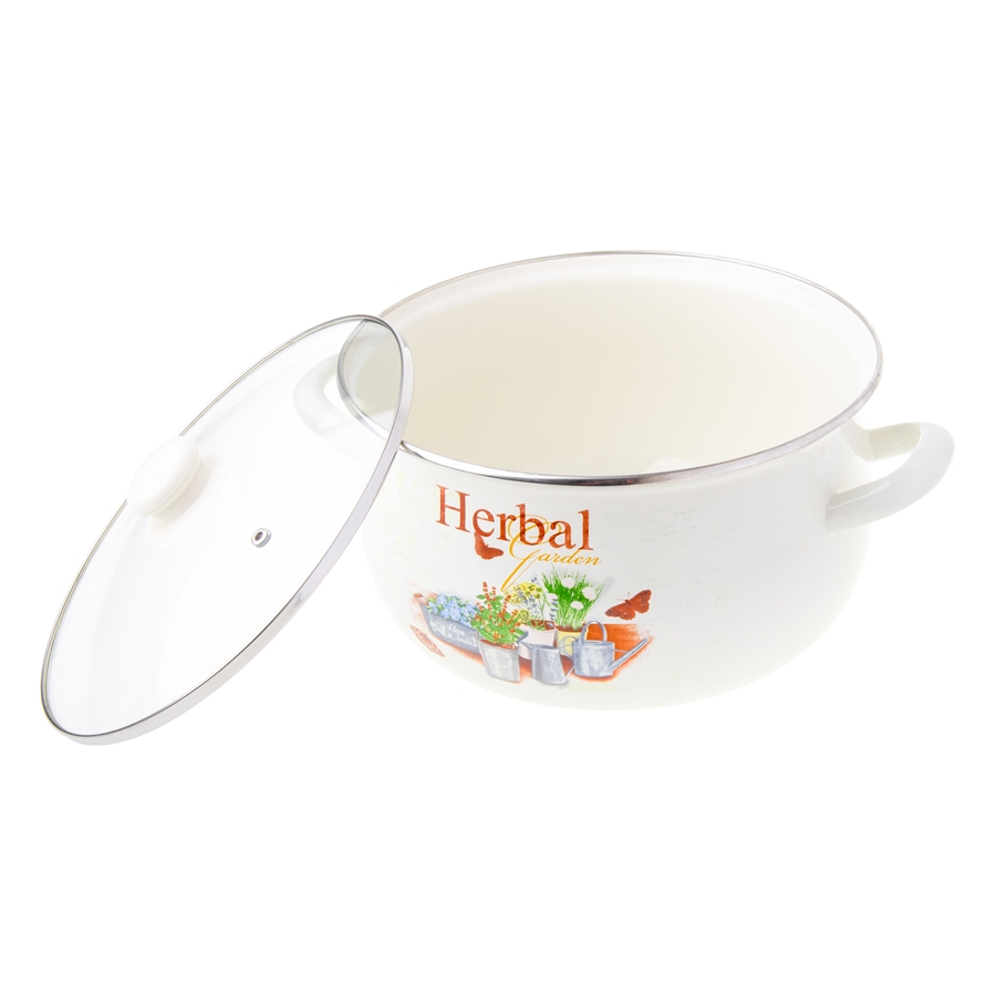 Garnek ZIOŁA – baryłka Garnek emaliowany ZIOŁA to praktyczne naczynie do codziennego gotowania. Wykonany ze stali i pokryty trwałą powłoką emaliowaną, skutecznie chroni przed korozją i pasuje do szerokiej gamy kuchenek. Kremowy kolor oraz motyw świeżych ziół dodają mu wyjątkowego charakteru, a szklana pokrywka i pojemność 6,2 L (średnica 24 cm) sprawiają, że świetnie sprawdzi się w każdej kuchni.